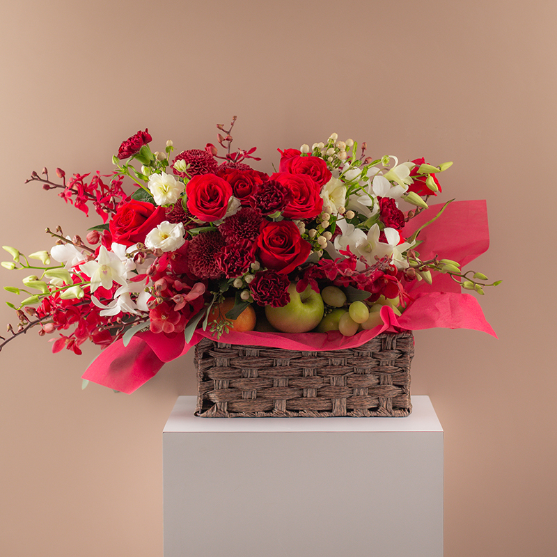 | Mom’s Heart What could be better than sending a basket of flowers and fruits for mum? Inspired by bright beautiful blooms, our expert florists gathered fresh orchids, carnations, roses and more in a rustic basket. A selection of fresh fruits are also included in. (12 Carnations, 8 Roses, 10 Assorted Orchids, Hypericum Berries, Assorted Fillers & Greens, Assorted Fruits) Price : RM 350.00 |