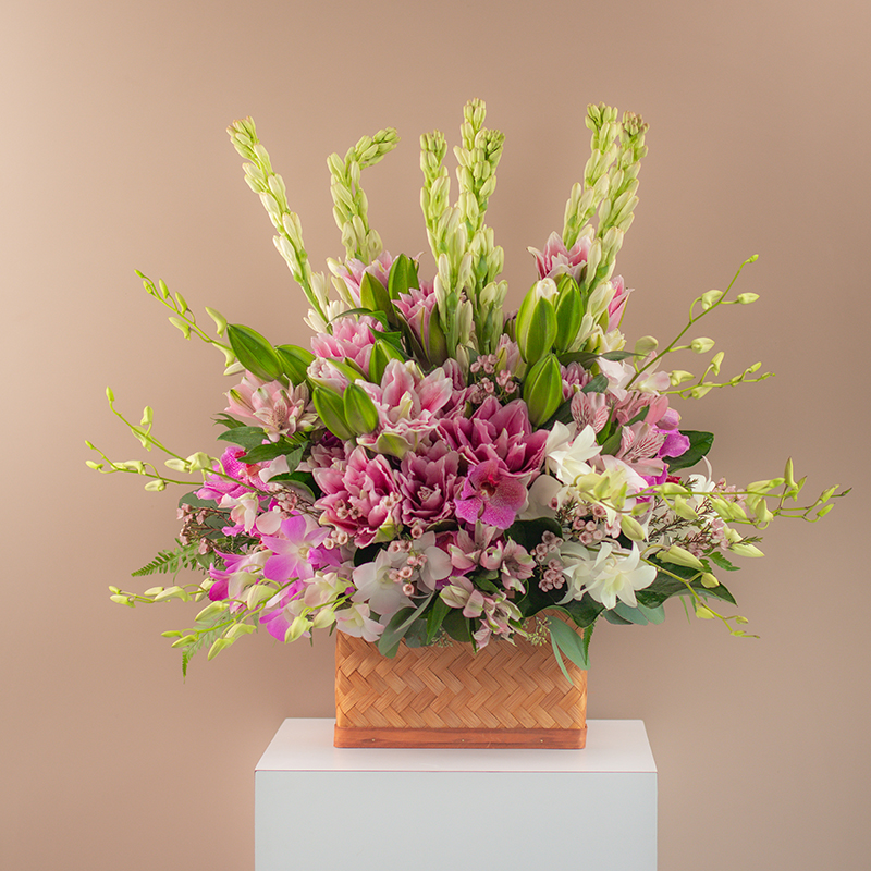 | Mother Nature Surprise mum with our garden inspired basket of spring colours! We've gathered a mixture of tropical orchids, alstroemerias, tuberoses and more, crafted in a basket. (18 Assorted Orchids, 3 Lilies, 5 Alstroemerias, 6 Tuberoses, Assorted Filler & Greens) Price : RM 250.00 |