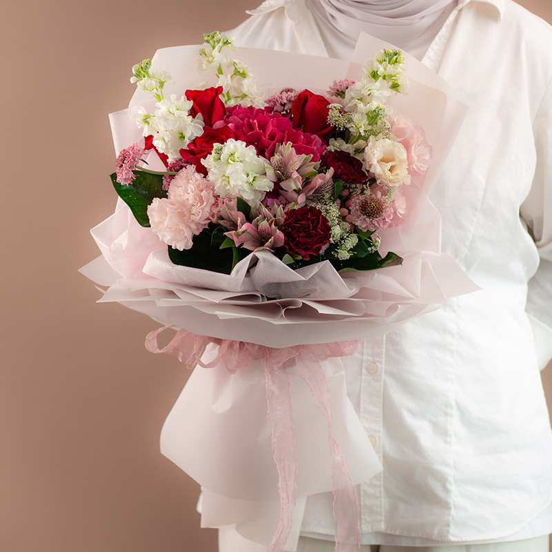 | Mother's Day Bouquet Highlight our vivid red, pink and white blooms with our Korean style bouquet this Mother’s Day. Red roses, alstroemerias, hydrangeas, carnations and eustomas are accented with white mattiolas and foliages in a hand-held bouquet. (As Shown - 1 Size Only) Price : RM 200.00 |
