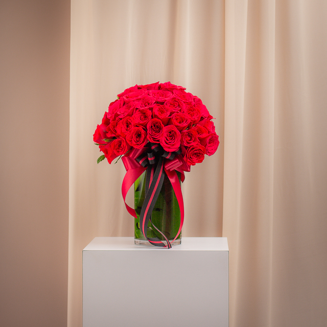 | Be Still My Heart Highlight our vivid red blooms with one of our modern vase arrangement this Valentine’s Day. 3 dozen red roses, accented with green foliages and a satin ribbon in a clear glass vase. (36 Roses, Assorted Greens) Price : RM 550.00 |