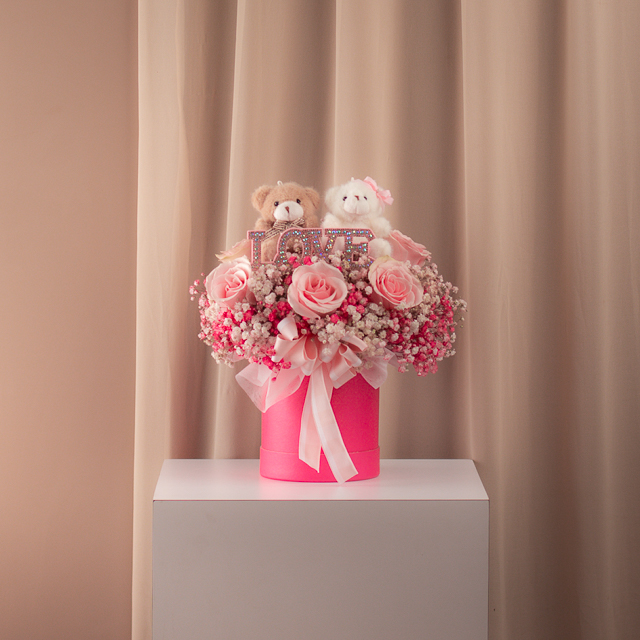| Honey Love Make Valentine’s Day extra special with our sweet pink roses, artfully arranged in a cloud of baby’s breath. A set of cute teddy bears and felt “LOVE” signage in added in, making your message even more memorable. (As Shown - 1 Size Only) Price : RM 225.00 |
