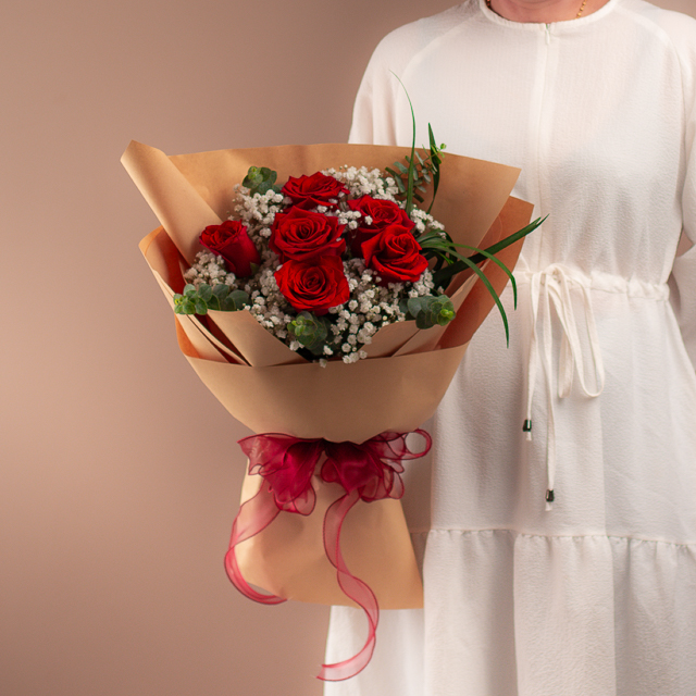 | Kiss Me Highlight our classic red blooms with one of our timeless beautiful bouquet this Valentine’s Day. Half dozen of long-stemmed red Taj Mahal roses are accented with baby’s breath and foliages. (6 Roses, Filler & Greens) Price : RM 200.00 |