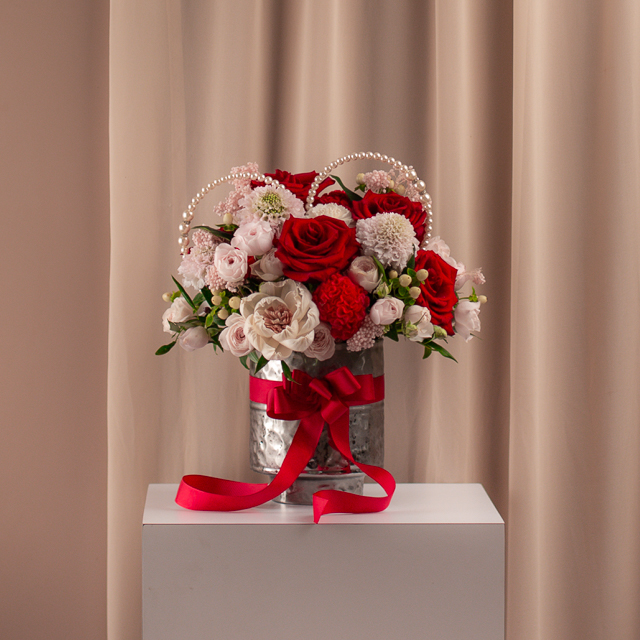 | Smitten Our delightful red roses and pink rose sprays arrangement is artistically gathered, decorated with a heart-shaped pearl band. Designed in a modern chrome vase, it captures the rich beauty of the blooms, along with the thoughtfulness of your sentiment. (As Shown - 1 Size Only) Price : RM 350.00 |