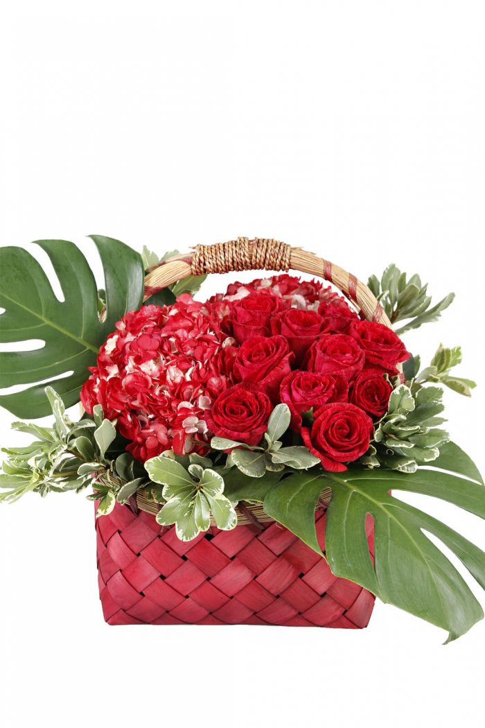 • Inspired by the colour red, our florists designed this gathering of fresh roses, hydrangeas and mixed greens inside a rustic woven basket. As a colour of passion and romance its a perfect gift to send to your loved ones today.