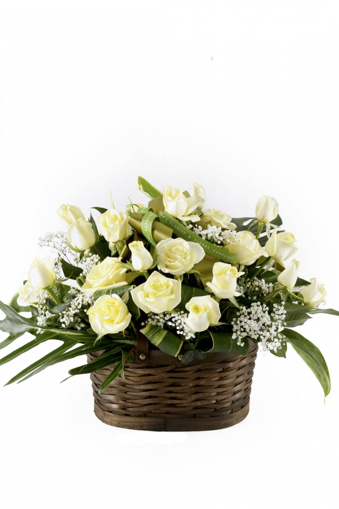 - Make with our classic white roses basket arrangement. Hand-crafted into a simple willow basket it\'s a lovely and touching way to express yourself.