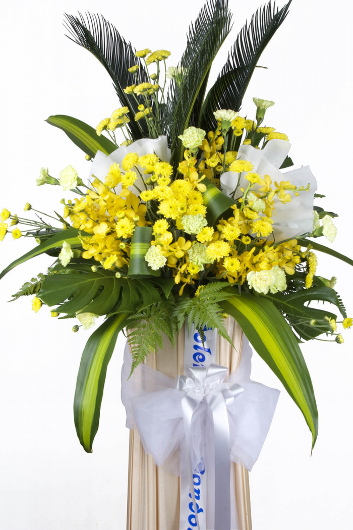 - This elegant standing spray provides a personalized tribute and living memorial to convey your care and concern. Hand-crafted with the freshest chrysanthemum pom-poms, mokara orchids and carnations on a wooden fabric stand.