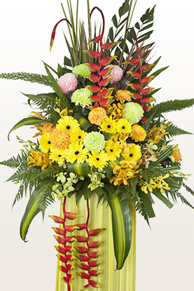 - Grace the opening of your esteemed business associates with an elegant standing floral arrangement comprising of yellow gerberas, sunlight chrysanthemums, aranda orchids, heliconias and assorted foliages.