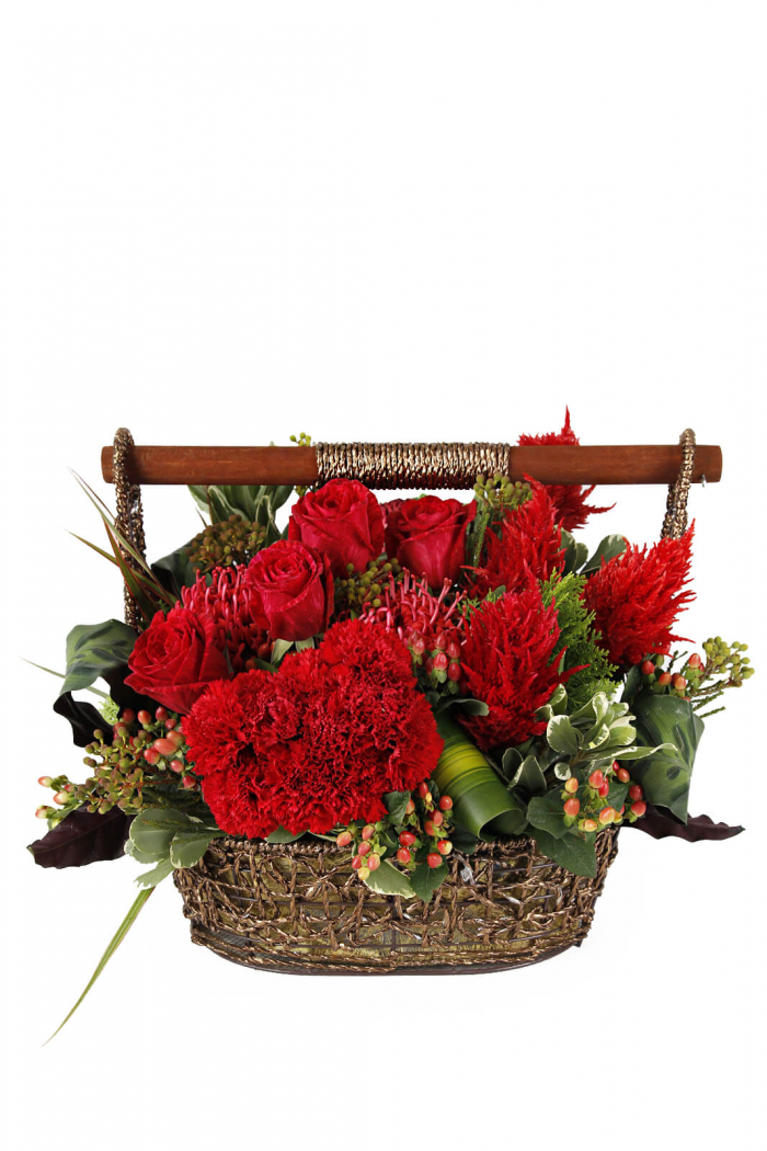 - With a blend of the classics and urban, our red roses, pin-cushions, hypericum berries, carnations and cockscomb is full of well-wishes. Let this beautiful arrangement help you send your loving wishes to friends, family and loved ones.