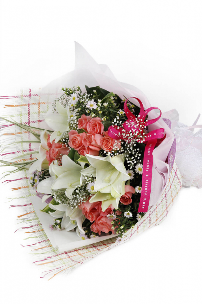 • A shining example of sugar and everything nice. That’s our sweet bouquet of pink roses and white lilies, gathered by hand artistically with assorted papers and ribbons.