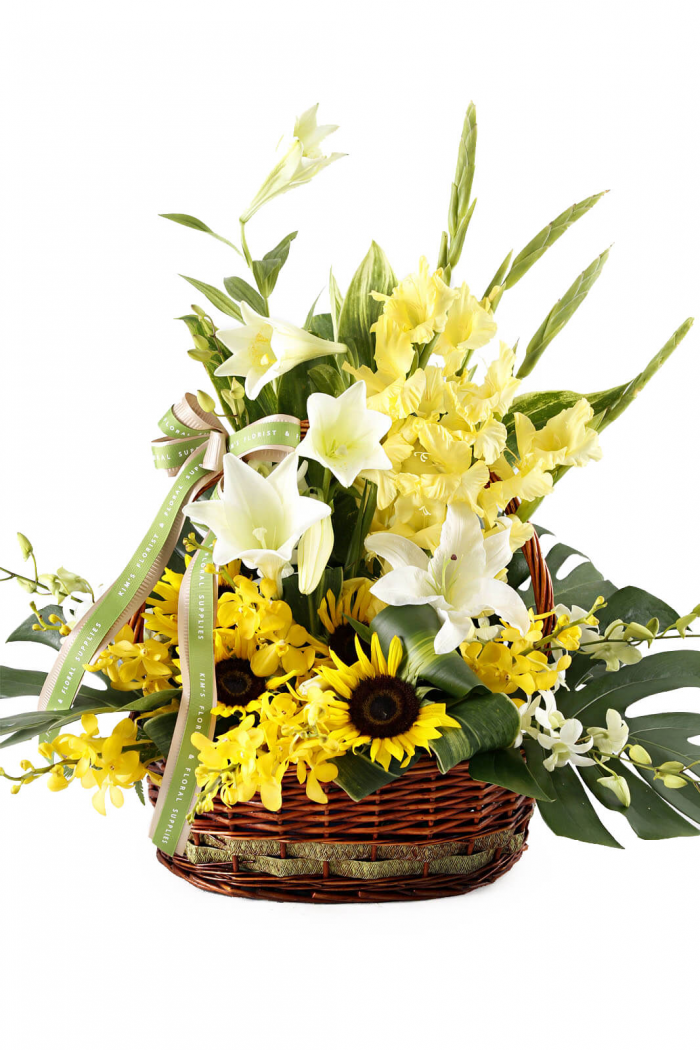 • For everyone out there who loves the sunshine, this bouquets for you! Cheerful sunflowers, white madonna lilies, golden yellow mokaras and gladiolus are hand-designed by our expert florists in a woven basket.