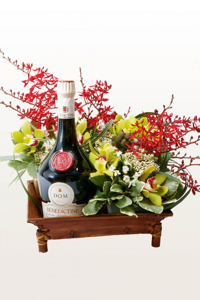 • Bless your loved ones with health and wellness from this beautiful arrangement of cymbidium orchids, rice flower and more, expertly arranged in a stained wooden tray. Paired with a bottle of Benedictine DOM, the road to recovery is on its way!