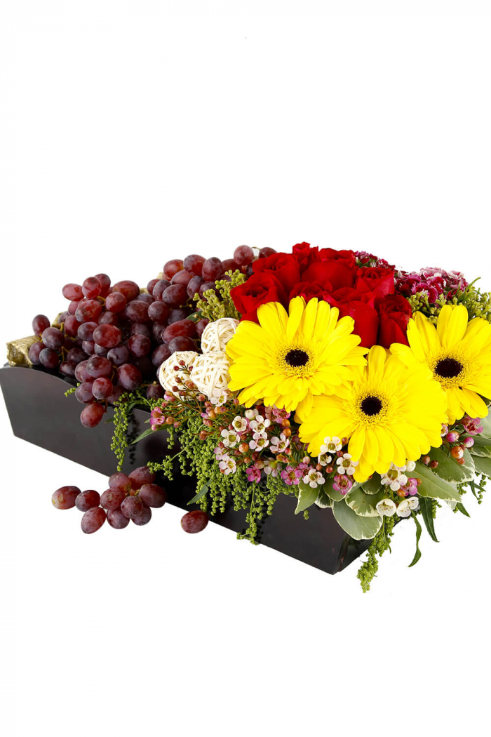 Here’s a gift that has joy and cheer written all over! Featuring our vibrant red roses and fresh gerbera daisies complimented with fresh seedless red grapes are gathered together beautifuly in a wooden tray arrangement, so that you can deliver a big bunch of smiles.
