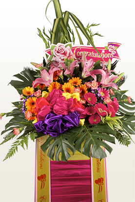 - Convey your unwavering support with this standing arrangement of multicoloured blooms to grace the joyous event with an air of distinction! Hand-gathered with the freshest gerberas, lilies, gladiolus and carnations it’s the perfect way to convey your highest compliments.