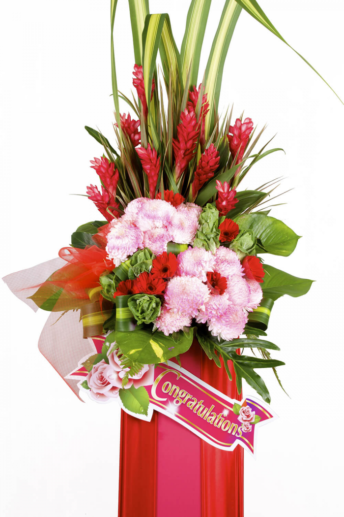 - Make a bold statement of support and friendship with this vibrant standing arrangement of red and pink blooms. Hand-gathered with the freshest gerberas, gingers and pink chrysanthemums it’s the perfect way to convey your best wishes.