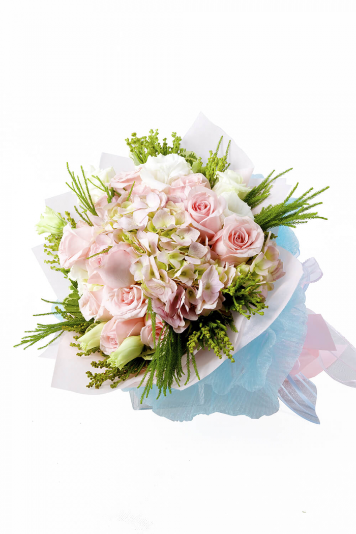 - It’s the essence of spring: soft pink roses, hydrangeas, white eustomas, green brunias and assorted greens, artfully arranged with decorative pastel wrappers to let their delicate beauty shine through.