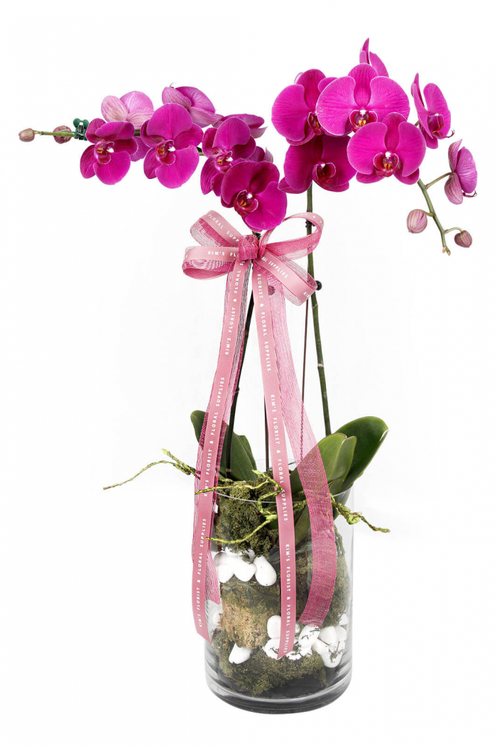 Surprise your loved ones with a cherry pink Phalaenopsis orchid plant. Also known as the moth orchid for it’s shapely blooms that resemble moths in flight, this beauty is hand-chosen by our florists and arrives in a glass planter.