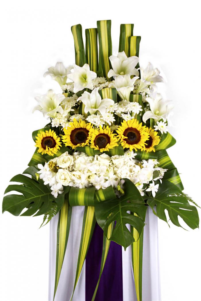 - This standing arrangement is created from fresh white lilies, pom-poms, roses, sunflowers and dendrobium orchids. This simple floral tribute shows your hope, faith and concern during this time of sorrow.
