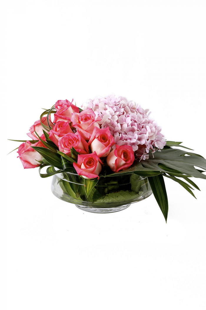 • It’s the perfect gift pink lovers have been waiting for - an exquisite arrangement of hot pink roses and baby pink hydrangeas accented with assorted foliages. Hand-designed by our expert florists in a simple glass vase, it’s the ideal gift for a loved one.