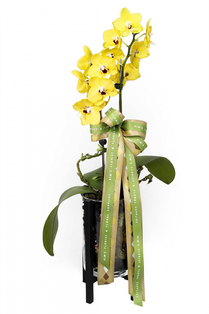 - This elegant, glass planter is filled with an exotically coloured mini Phalaenopsis topped with a beautiful satin ribbon. Give it the proper showplace, and this exquisite gift will shine bright as gold.