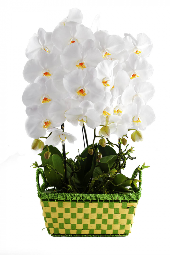 Make a bold style statement with the exotic beauty of our orchid garden. Artistically arranged in a woven seagrass basket, three lush white Phalaenopsis orchids are set off by rich green leaves. Surprisingly simple care too: Orchids get most of their nutrients from the air and water, so they thrive easily.