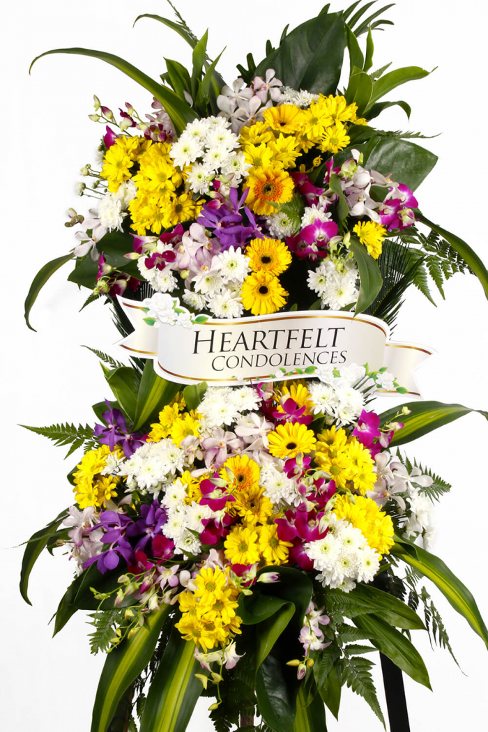 • Crafted from mixed coloured blooms, our tasteful standing arrangement is a thoughtful gesture of your care and concern in this time of sorrow. Hand-gathered with the freshest roses, mums, gerberas and more, it’s a beautiful expression of all the love in your heart as well as a touching way to remember a loved one who has passed.