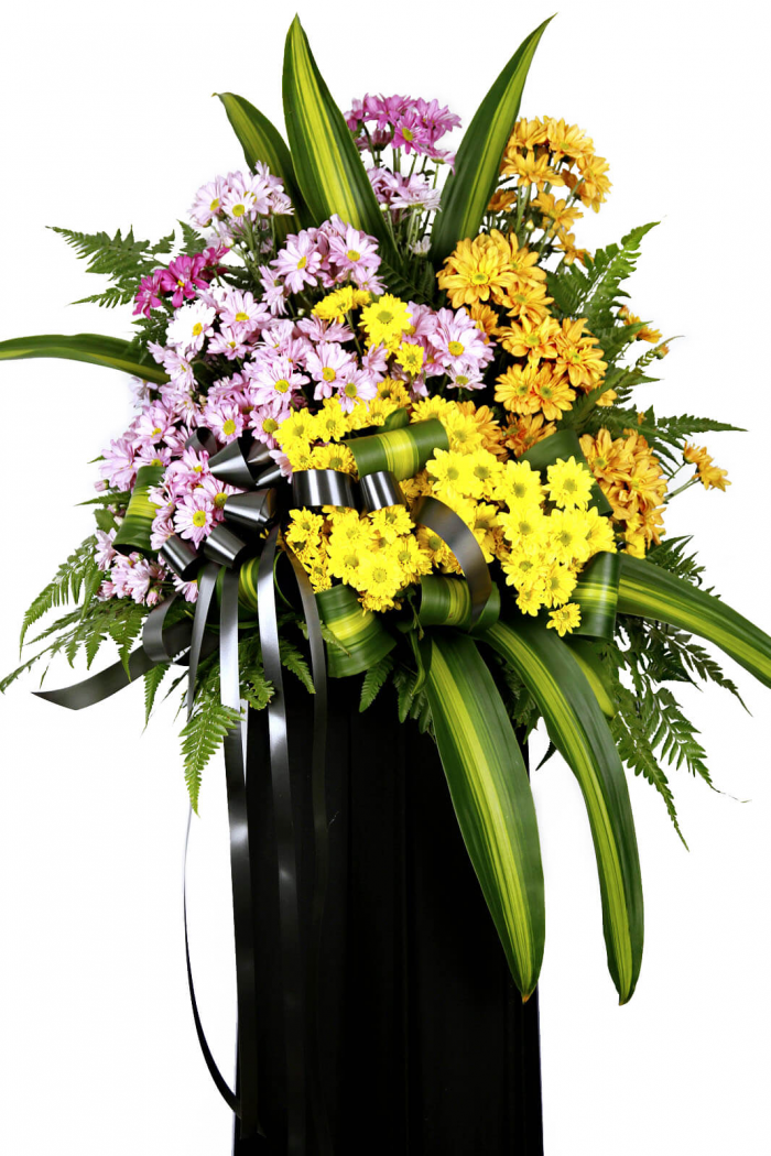 - Gathered fresh with pom-poms and assorted foliages, this expertly crafted standing arrangement is a simple and tasteful expression of your care and concern. Appropriate for family, friends or business associates to send directly to the funeral home.