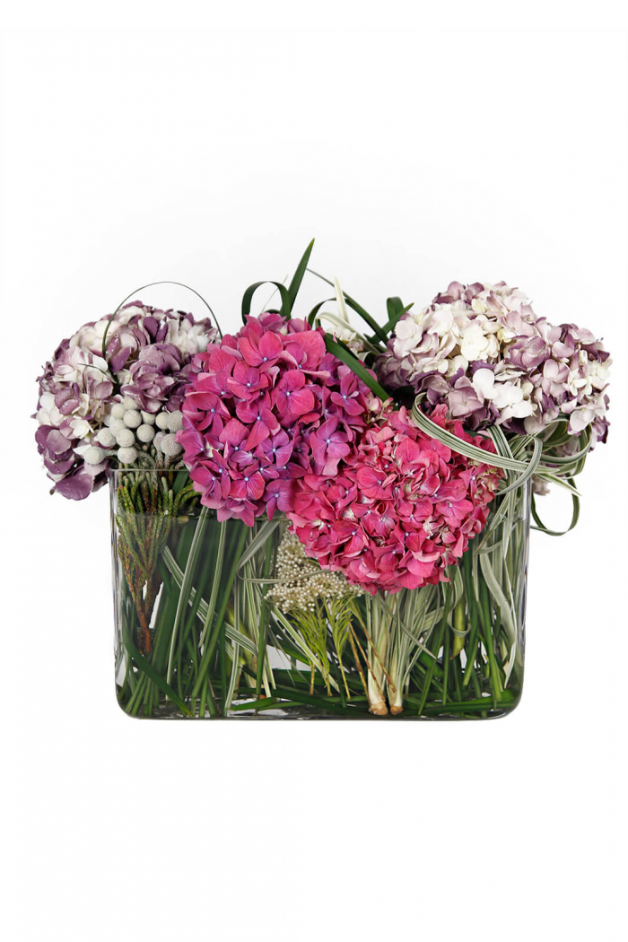 • Also known as mopheads, these vibrantly colourful hydrangeas take centerstage with complimenting assorted greens. Its a standout gift that fills a countertop or any decor with classic beauty.