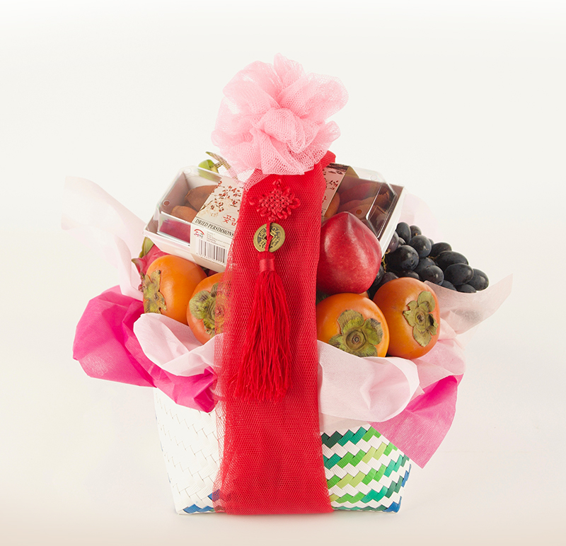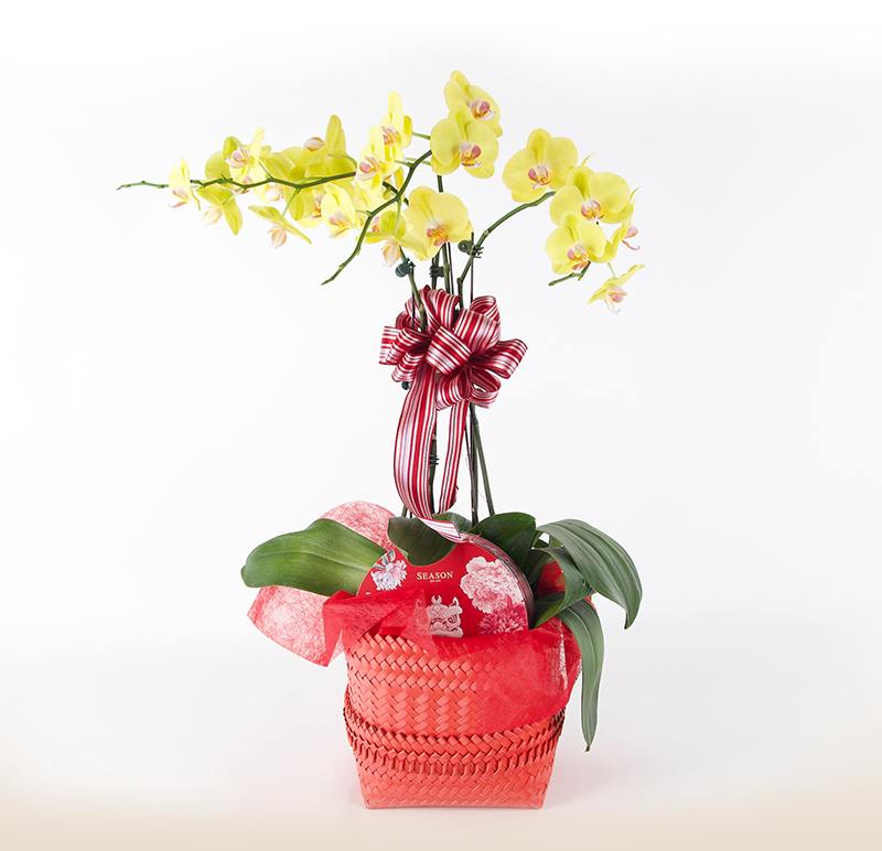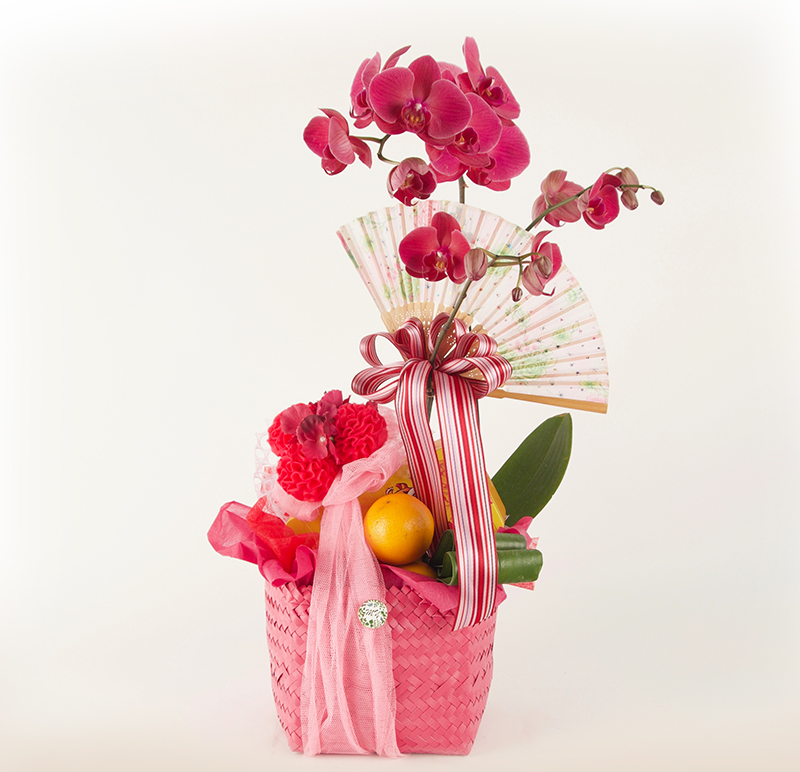 TRIBAL WOMEN HOT PINK SQUARE BAG,PHALAENOPSIS ORCHID PLANT,12 PREMIUM MANDARINS, SEASON’S KUIH LAPIS CAKE, ARTISANAL GIFT- PACKAGING,GREETING CARD
