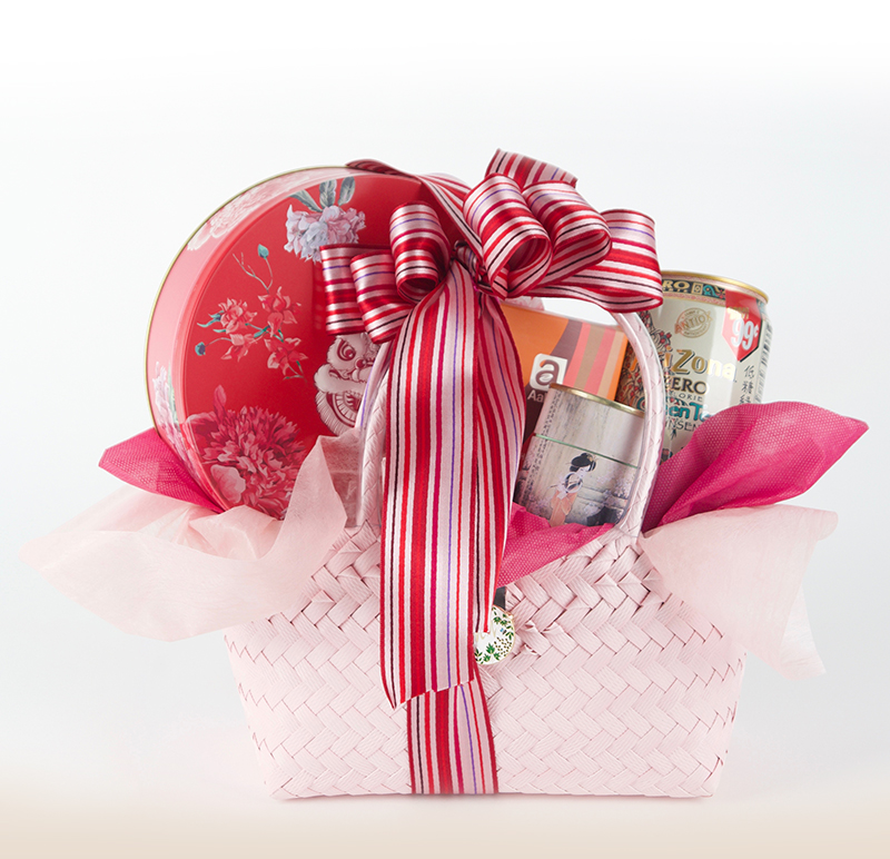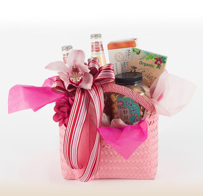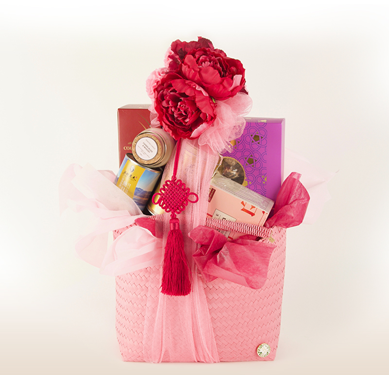 TRIBAL WOMEN BUBBLEGUM PINK TOTE GRANDE BAG (S),PURPLE CANE TEA ART CENTRE- PUER 30GM,GODIVA BELGIUM 1926 145GM,SEASON’S RED VELVET ALMOND CHOCOLATE 280GM,HF GINGER TEA W/ LONGAN 22GM,HAWTHORN VINEGAR 250ML,ARTISANAL GIFT- PACKAGING,GREETING CARD