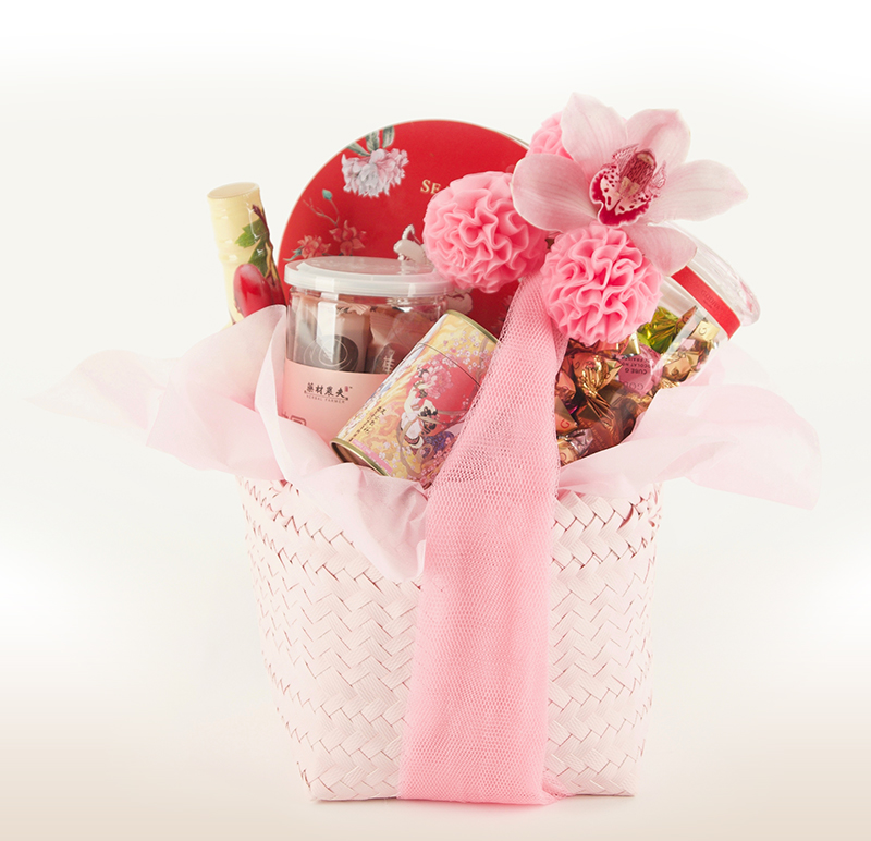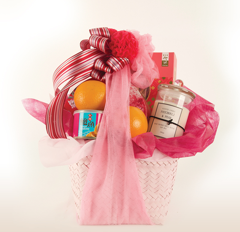 TRIBAL WOMEN SWEET-PINK SQUARE BAG,MUSHROOM SLICE GIFT BOX 100GM,SEASON’S RED VELVET ALMOND CHOCOLATE,8 PREMIUM MANDARINS,EYS BRAISED ABALONE 160GM,SCENTED CANDLE PATCHOULI & PEAR 180GM,ARTISANAL GIFT- PACKAGING,GREETING CARD