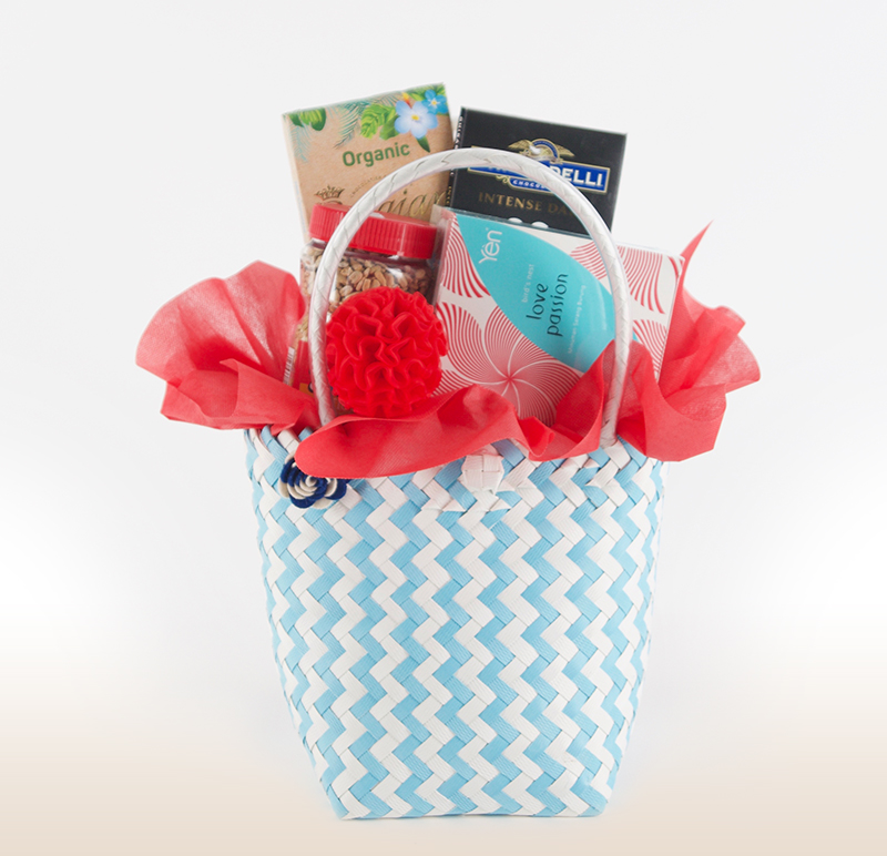 TRIBAL WOMEN BABY BLUE/ WHITE CLASSIC ZIGZAG BAG (S),FISHER SEASALT SUNFLOWER KERNELS DRY ROASTED 205GM,EYS YEN-BIRD’S NEST LOVE PASSION 6x50ML,GHIRARDELLI CHOCOLATE 90GM,ORGANIC BELGIAN 90GM,ARTISANAL GIFT- PACKAGING,GREETING CARD