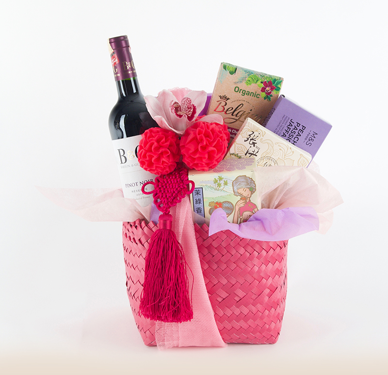 TRIBAL WOMEN PINK TIFFIN CARRIER (S),B&G PINOT NOIR RESERVE 2016 750ML,EYS FINELY SELECTED FISH MAW 60GM,PURPLE CANE SPECIALITY JASMINE TEA 100GM,DURIAN CANDY WITH ORGANIC MOLASSES SUGAR 40GM,M&S FOOD PEACH& PASSION FRUIT JAFFA CAKES 125GM,ORGANIC BELGIAN 90GM,ARTISANAL GIFT- PACKAGING,GREETING CARD