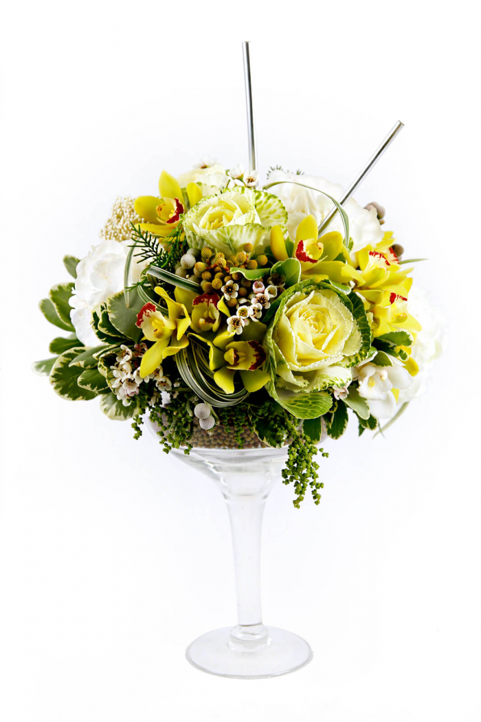 - Toast that special occasion in style. Mixed with brassicas, hydrangeas, cymbidium orchids, and wax flowers, this fresh floral cocktail is hand-crafted in an oversized wineglass vase. Accented with silver-coloured straws, its an unforgettable gift that will keep the party alive.
