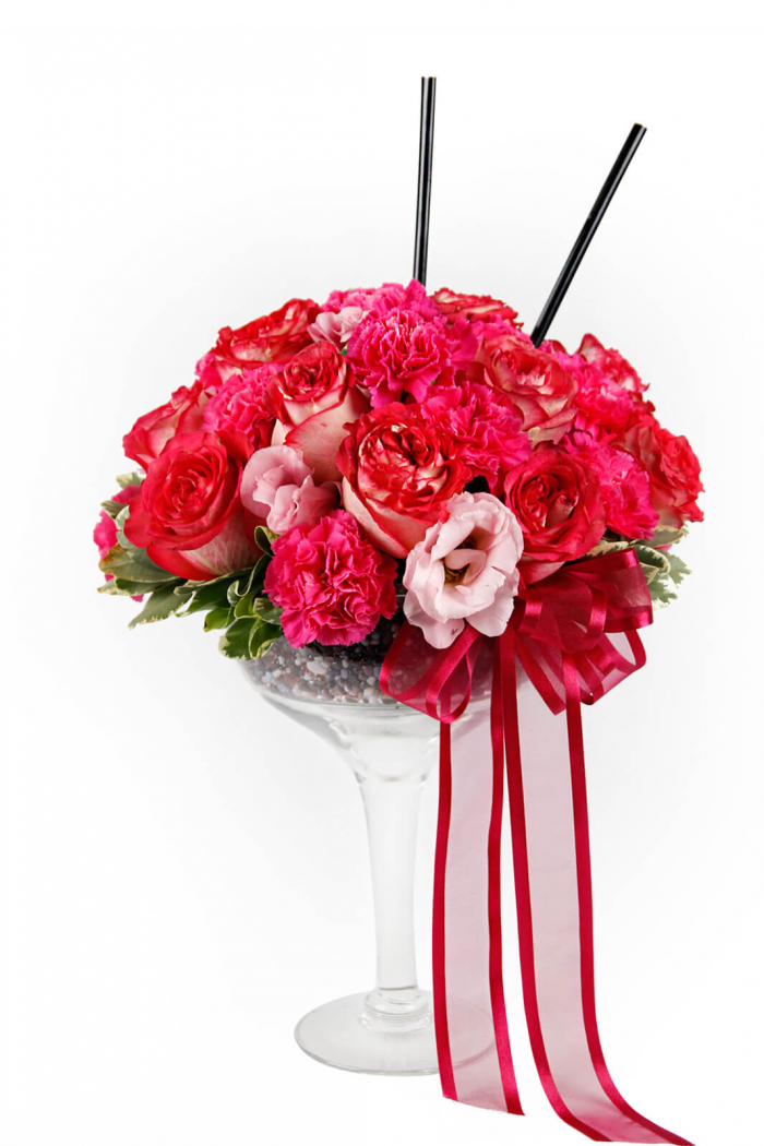 - Unleash her inner pink with this flirty floral cocktail arrangement of fuschia roses, carnations and eustomas. Designed in an oversized wineglass vase, its perfect gift to toast any celebration.