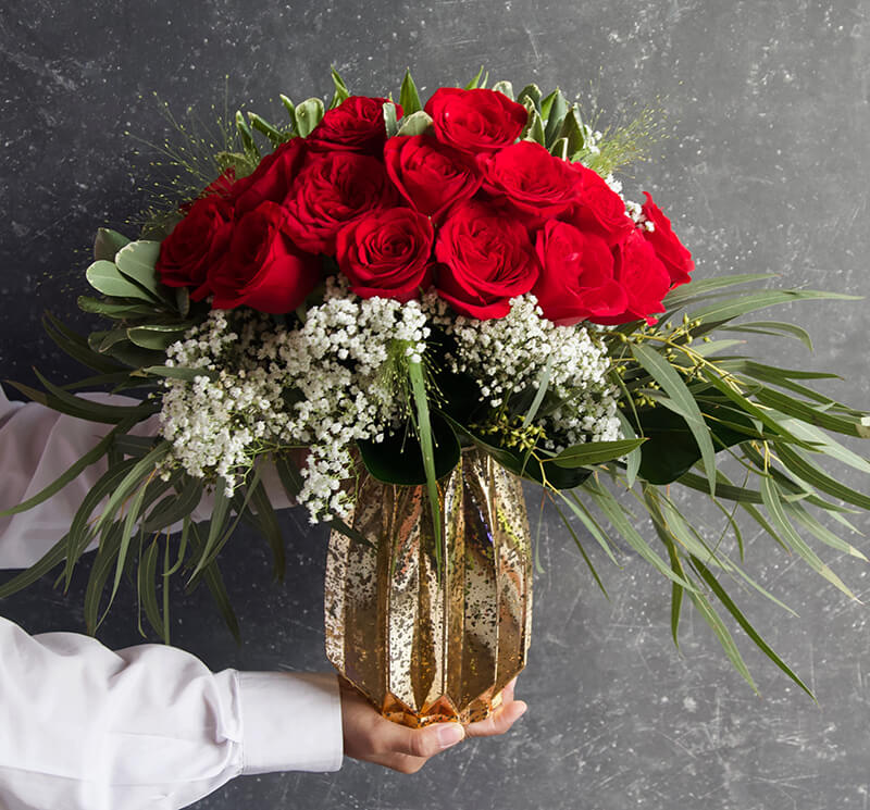 Flowers speak louder than words, and our elegant 15 long-stemmed Taj Mahal red roses speak volumes! Hand-arranged with lush greenery and million star, each radiant bloom will help you express your love in the most romantic way.