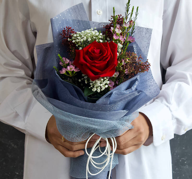 Our premium red Ecuador single stalk rose bouquet is an elegant surprise for the the one you love with all your heart. Beautifully arranged with textured papers and netting, our single radiant bloom is hand-delivered and ready to delight your Valentine.