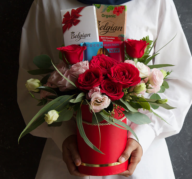 Surprise your love with this magical box of sweet delights. An assortment of premium chocolates are arranged together with red Taj Mahal roses, pink eustomas and foliages.