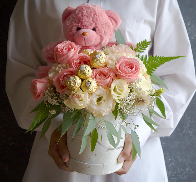 Beautiful things happen when sweet meets cuddly. Surprise your Valentine with an arrangement of our pink roses and champagne eustomas, paired with an adorable plush teddy bear and Ferrero Rocher chocolates.