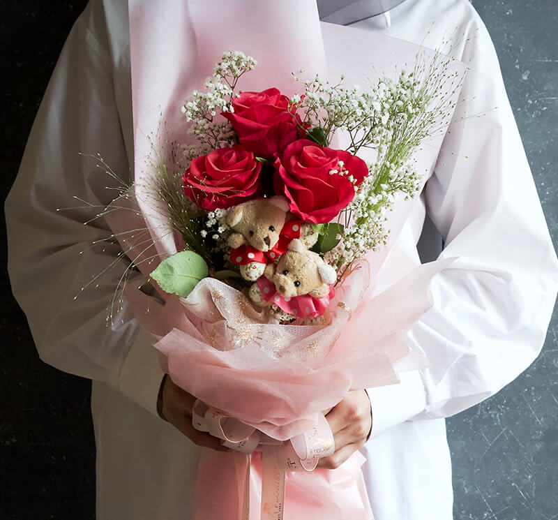 Send your love to your Valentine with our romantic 3 stalks long-stemmed premium imported China fuchsia pink roses artistically arranged in a hand-tied bouquet. A pair of cute teddies are included, to give extra cuteness.