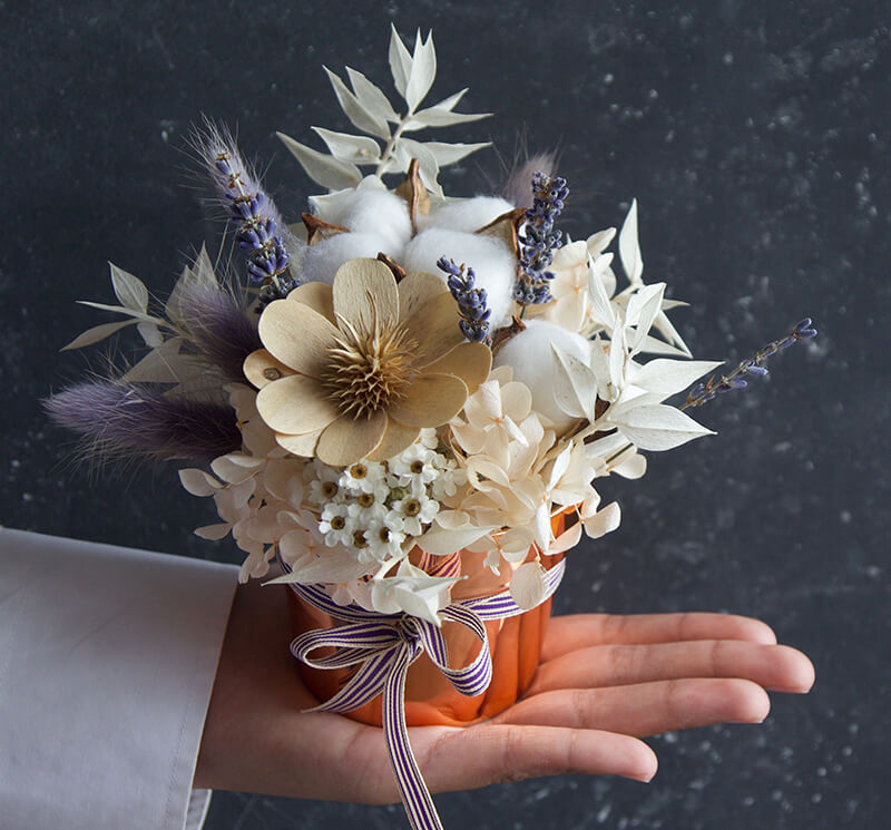 The best way to express how you feel is through flowers. Our rustic, assorted dried flowers such as cotton flower, lavender, hydrangeas and more is artfully crafted in a rose-gold pot. A perfect way to put your sentiments front and center.