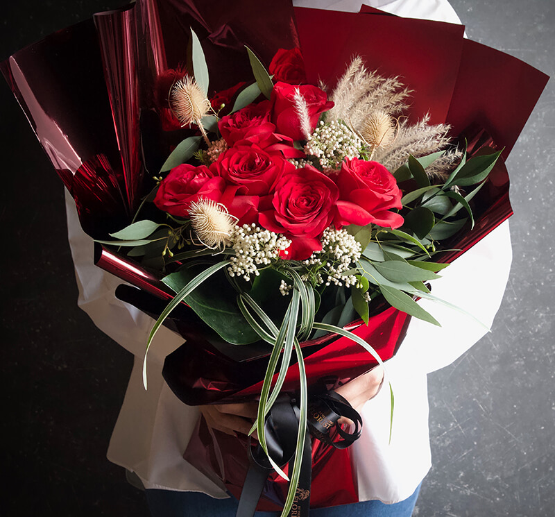 Highlight our classic red blooms with one of our timeless beautiful bouquet this Valentine’s Day. 6 stems of long-stemmed red Taj Mahal roses are accented with dried flowers and foliages.