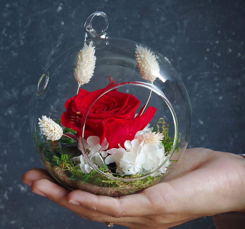 For a love that never fades - a keepsake treasure that will last forever. It’s set in a glass globe that can be a tabletop accent or hung up as a display. Preserved flowers are 100% natural products that have undergone a preservation process with no need for water or sunlight.